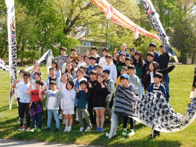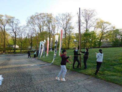 メイプルタイムには、全員がこいのぼりの前に集まり、写真を撮りました。あいにく風があまり強くなかったのでこいのぼりを手にもって撮影しました。