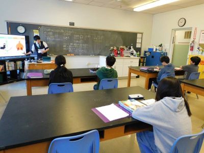 同じ時間7年生は、理科です。今日は、「マツの種子までができるまでを調べアブラナと比べよう」をテーマに被子植物と裸子植物の特徴についてまとめていきました。その際、雌花、雄花の性質にも触れ、それぞれが虫媒花、風媒花であることも確認していました。