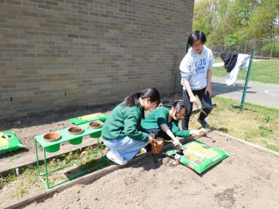 お昼休み、中等部の生活環境員会のメンバーが種まきの準備をしていました。種をまくプランターは、昨年度6年生の卒業制作として作った作品です。きれいな花が咲くのを楽しみにしています。
