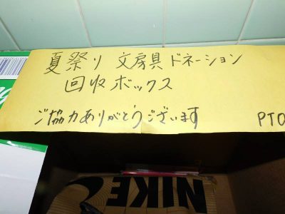 本日からPTO夏祭りに向け、“文房具ドネーション回収ボックス”が玄関入り口に設置されました。早速、数件のドネーションが届きました。皆様の御協力をお願いいたします。