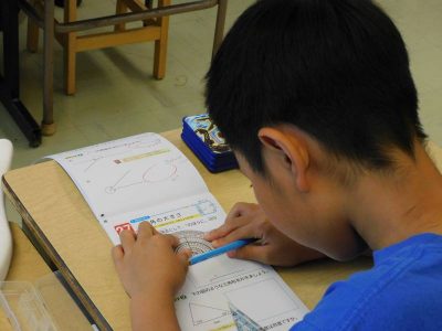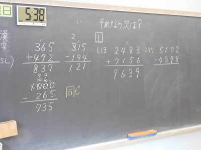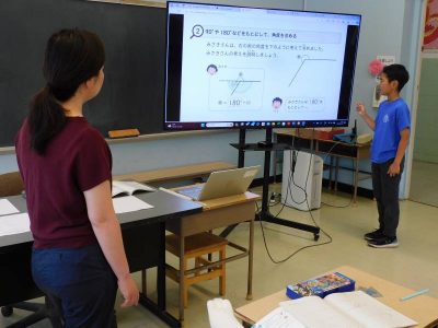 同じ時間4年生も算数でした。今日は90度や180度等を参考に角度をもとめる問題に挑戦していました。私が教室に入った時は、その求め方を説明していました。続いて同じ問題の別の解き方も考えていました。