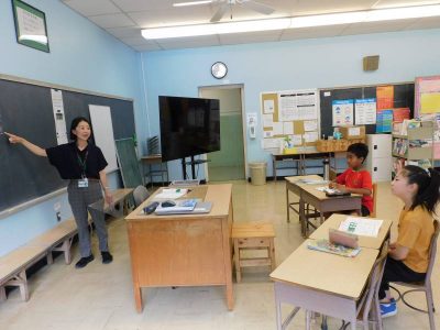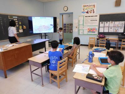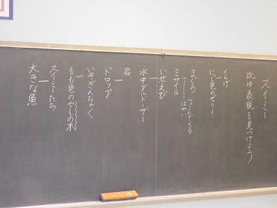 本来であれば2年生は本日、リッジウッドの町探検に出かける予定でしたが、天候が不順なため来週に延期となりました。そのため1時間目は、国語の学習です。今日は、教科書にある「スイミー」に出てくる比喩表現を見つけました。途中、分かりづらい言葉はすぐiPadで検索し、ミラーリングしながらみんなで共有していました。