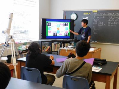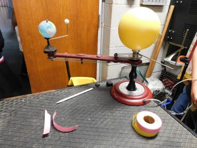 9年生2時間目は、理科です。今日は、季節によって昼の長さや南中高度が変わる理由を考えました。最初にコナーズホールで、三球儀を使いながら季節による昼の長さ等を確認し、後半は教室でまとめを行いました。三球儀を使った実演がとても分かりやすかったため、前述の理由を問われた際、皆すぐ答えることができました。