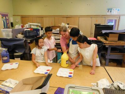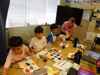 5年生3時間目は、ARTです。私が教室に入った時は、花びらの形をした紙に色を付けていました。赤、青、黄の三色から緑色や紫色等を作り出す際には、K先生に確認しながら行っていました。