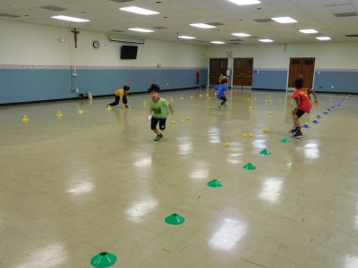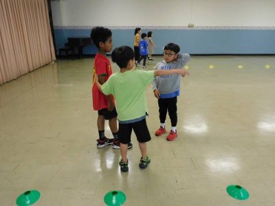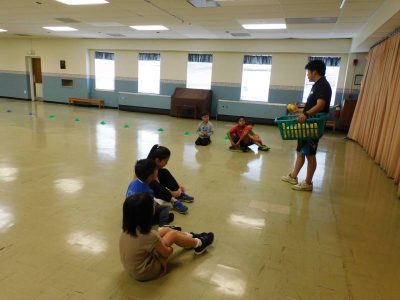 2,3年生4時間目は、体育です。今日は、コーンの上にボールを置く競技を行いました。まずグループごとに作戦会議を行い、その後ゲームスタート。約3分間の競技でもみなかなりの体力を消耗している様子でした。