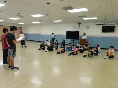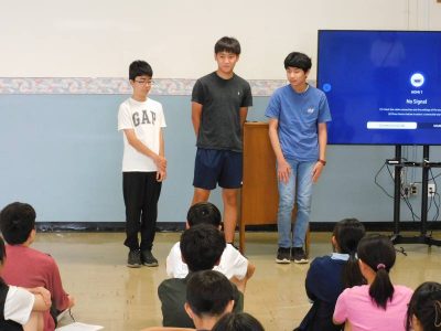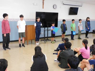 2時間目には、始業式です。最初に2学期からの転入生紹介がありました。続く始業式で私からは、2学期もいろいろなことに興味(疑問)をもち、自分で解決していく習慣を身に付けてほしいという願いを伝えました。また、児童・生徒代表からはそれぞれ、2学期頑張りたいことが具体的に発表され、思わず応援したくなりました。そして最後に、校歌を歌いました。