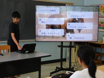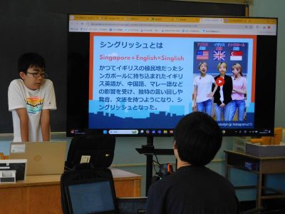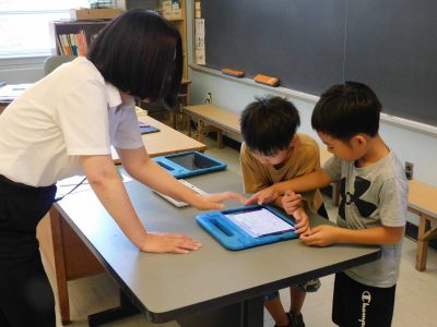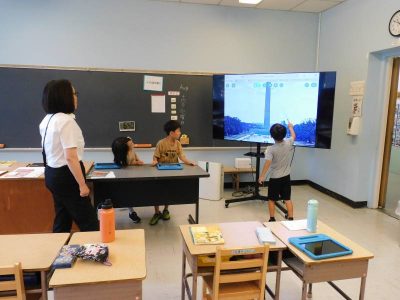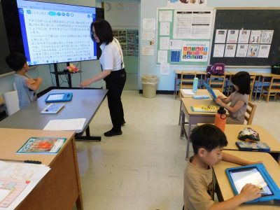 2年生3時間目は、国語です。今日は、今週の土曜参観日で発表する自由研究プレゼンの練習をしていました。発表者、iPad操作、計時と役割分担し、協力しながらプレゼン準備を進めていました。持ち時間内にどう収めるかも互いに相談していました。