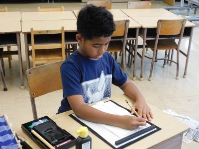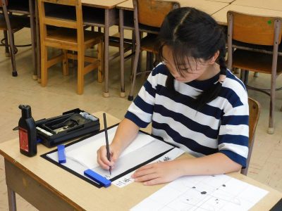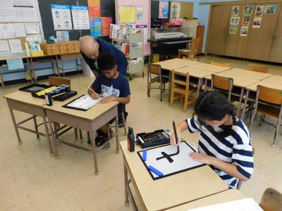 同じ時間3年生は、書写です。私が教室に入った時は、「土」の文字に挑戦していました。また、小筆を使いながら名前を書く練習もしていました。姿勢を正し、緊張感をもって取り組んでいました。