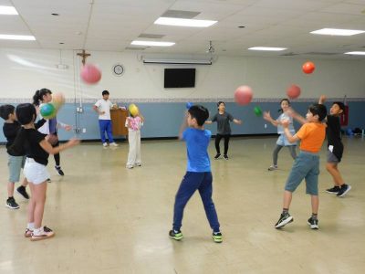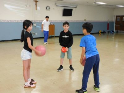 同じ時間4~6年生は、体育です。今日は球技の練習に取り組んでいました。3人一組や全員で、掛け声をもとにボールを右隣に渡していきます。一見簡単そうに見えますが、渡すタイミングと受け取るタイミングが同時であるため、予想以上に苦労していました。