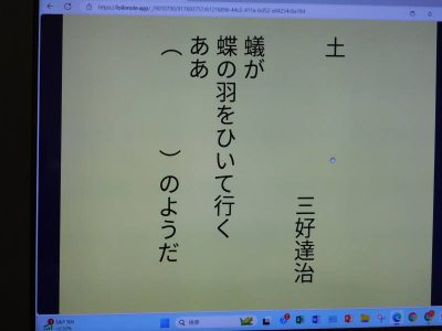 7年生4時間目は、国語です。今日は、「比喩」の学習です。私が教室に入った時は、三好達治の作品について考えているところでした。皆さんなら画面にある空欄にどのような言葉をいれますか?ヒントは、“カタカナ3文字と海”です。