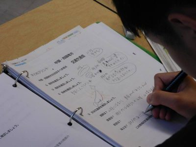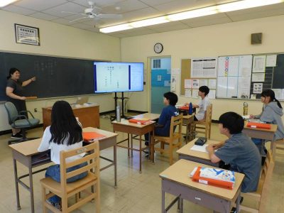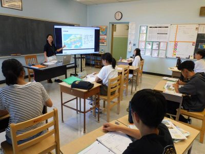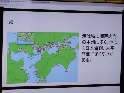 同じ時間8年生は社会科で、今日は中国・四国地方の交通や通信についての復習です。1学期に生徒たちが作成したスライドを活用しながら、授業が進められていました。説明を聴きながら自主的にメモをとる姿が印象的でした。