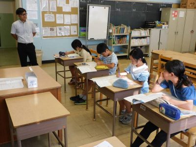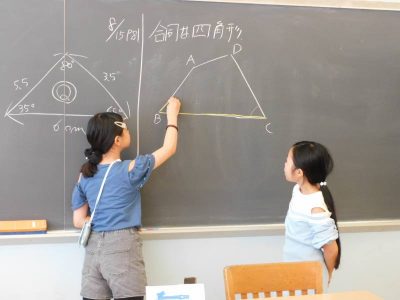 同じ時間5年生は、算数です。私が教室に入った時は、ある4角形の作図方法についてアイディアを出し合っていました。まず個人で考え、その後隣同士自分の考えを共有します。そして、最後に発表していました。