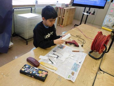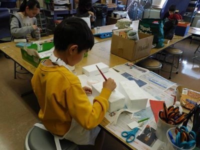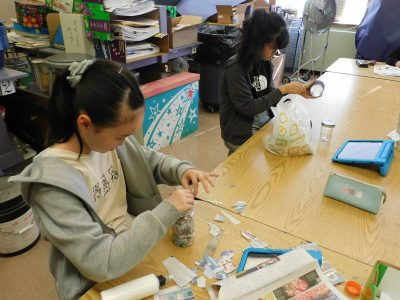 その時間6年生は、ARTです。リサイクル品を使いながら自分たちの発想で自由に作品を作っていきます。どんな作品に仕上がるのか楽しみです。