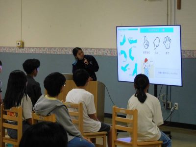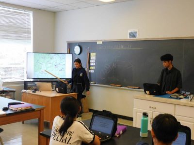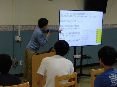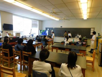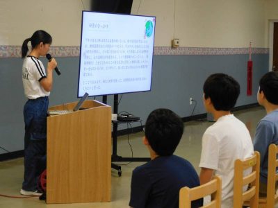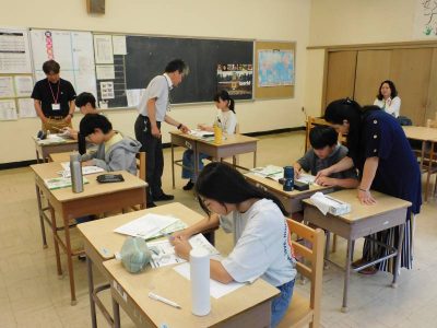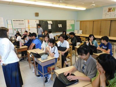 同じ時間8年生は、理科です。今日は、今まで学習した内容を活用し、ニュースキャスター、 気象予報士に扮して天気予報シーンを再現しました。聞き手を飽きさせないユーモアあふれる発表ではあったもの、気象のメカニズムをしっかり理解している様子がよくわかりました。