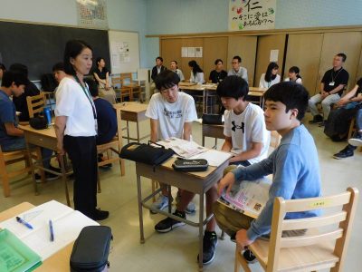 9年生は、社会科で今日のテーマは、「政治と民主主義」です。私が教室に入った時は、多数決の原理や少数意見の尊重についてグループで相談していました。