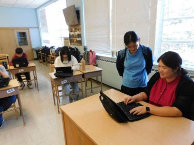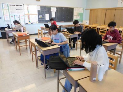 同じ時間8年生は国語で、今日は短歌の学習です。自分の好きなテーマで自由に作ります。出来上がった作品を確認してもらっていました。