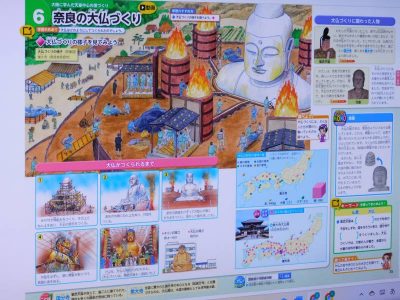 同じ時間、6年生は社会科です。今日は、東大寺の大仏建立に関わりの深い行基について学習しました。なぜ行基が大仏づくりの中心となったのか、その生い立ちや実際に行ったことなどを調べながらその理由を探りました。