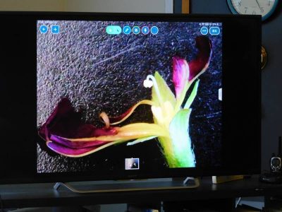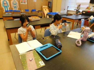 5年生3時間目は、理科です。今日は、アサガオの花を使って、花粉がいつめしべにつくのか確認しました。大きな虫眼鏡で花を見たり、予想とその実験結果から考察したりする様子がとても楽しそうでした。