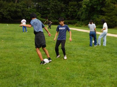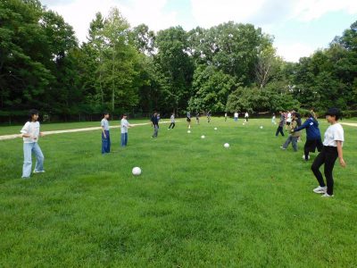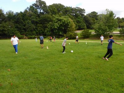 中等部6時間目は、体育です。今日はグラウンドで、サッカーの学習をしていました。グラウンドの芝が伸びていてボールがすぐ止まってしまうため、パス練習やボールコントロールが難しそうでした。
