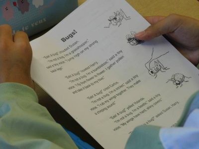 同じ時間4~6年生は、ESLの時間です。N先生の授業では、“Bug”に関わるテキストを使いながら学習していました。途中、bugと insect両方が登場し、使い分けを難しく感じているようでした。