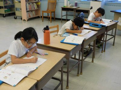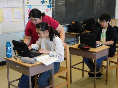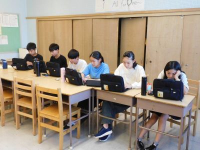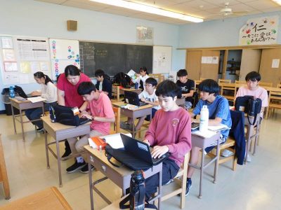 同じ時間9年生は、国語です。単元のまとめとして、30分間で400文字の文章を書き上げる練習をしていました。教科書に出てくる登場人物の「希望」について、生徒自身の考えを織り交ぜながら作業を進めていました。