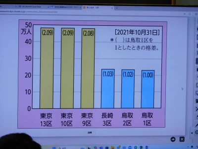 9年生1時間目は、社会科です。今日のテーマは、「選挙の課題と私たちの政治参加」です。年齢による投票率の割合、一票の格差等について9年生らしい分析内容が聞かれました。