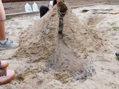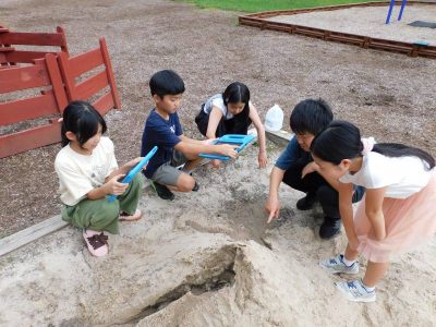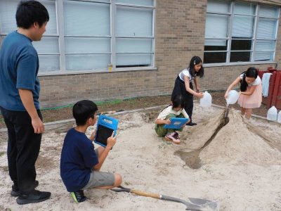 5年生3時間目は、理科です。今日は、川における“浸食”、“運搬”、“堆積”の働きについての学習です。中庭にある砂場に山を作り、上流にあたる部分から水を流します。実際のミニチュア版ですが、水による浸食の仕方や砂の堆積状態がとてもリアルで、子供たちは実験結果に大満足の様子でした。