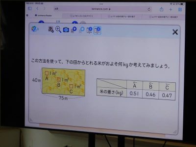 同じ時間、6年生は算数です。今日は最初にグラフの学習をした後、田んぼ1㎡のコメの量から田んぼ一面から収穫できるお米の量を予想しました。