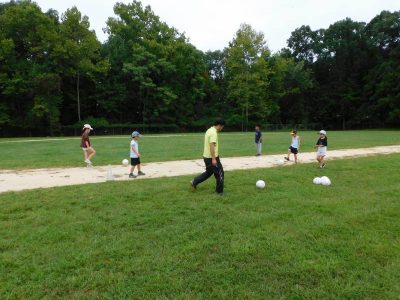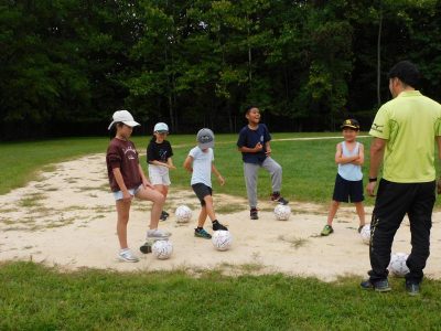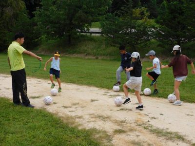 2,3年生3時間目は、体育です。今日はサッカーの学習で、ボールコントロールやパスの練習をしていました。芝が長いのでかなり強く蹴ってもすぐ止まり、苦労している様子でした。