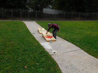 グランドから校舎に戻る際、教頭先生が昨年度の卒業制作であるコーンホールにニスを塗ってくださっていました。二度塗りまでしていだだき、本体は見違えるほどきれいになりました。