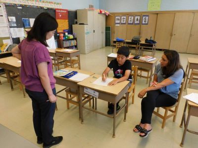同じ時間4年生は、英語です。私が教室に入った時は、“音楽を聴きながら勉強するのは良いと思うか”について、自分の考えを英文で書く作業をしていました。教員からのヒントをもとに、理由を一生懸命考えていました。