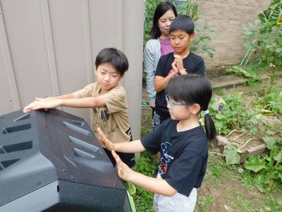 昼休み、学校農園にあるコンポストに肥料となる野菜や果物の皮などを入れていました。入れたあとは、何回かよく回しました。栄養のある肥料ができるといいなと思いました。