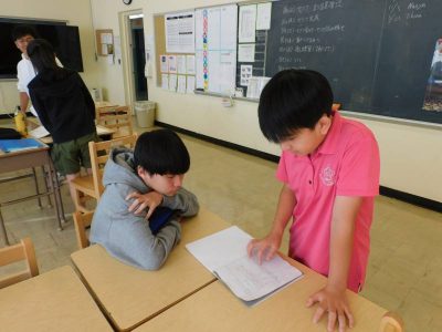 7年生1時間目は、数学で今日は関数の学習です。最初に関数の意味を確認した後、各自が考えた関数問題を互いに共有していました。