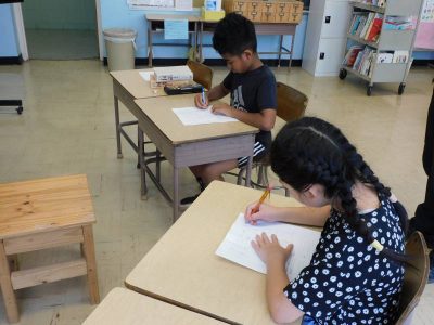 3年生3時間目は、書写です。今日は最初に、文字を書く前に言葉の意味を辞書で確認しました。その後、見本を見ながら一文字ずつ丁寧に練習していきました。