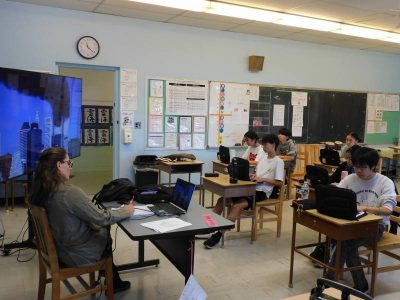 同じ時間中等部は、ESLです。今日9月11日は、23年前に同時多発テロが発生した日です。ESL授業でも当時の様子についてのビデオを見ていました。途中、生徒たちがメモを取る姿に、今日という日を忘れないようとする気持ちを感じました。