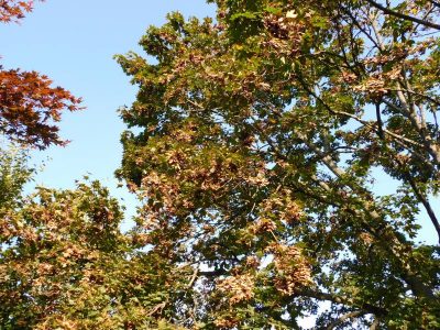 日本はまだ、“猛暑日”や“熱中症警戒アラート”という言葉が目立ちますが、オークランドの季節は確実に秋へと移りつつあります。今朝出勤するとメイプル広場に、メイプルの葉がたくさん落ちていました。それを見た教頭先生は、ブロアーで落ち葉を集めてくださいました。メイプルの葉の間には、ぎっしり種がついています。学校周辺の木々も緑から少しずつ黄色や赤色の部分が見られるようになりました。