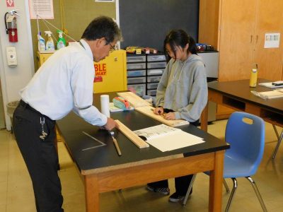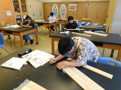 同じ時間7年生は、技術科です。今日は本箱の材用となる木材に、直接作図していました。全員集中して、黙々と作業に取り組んでいました。