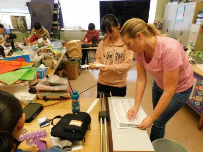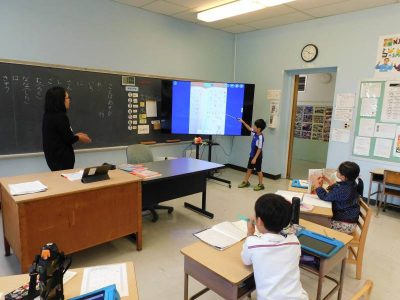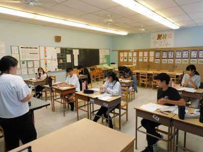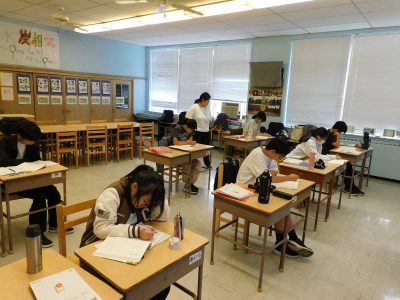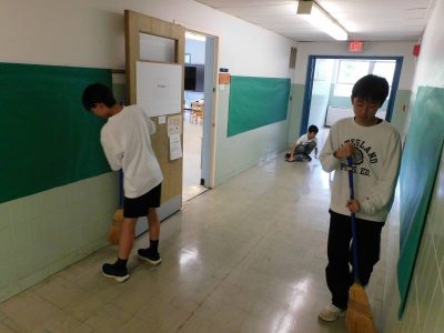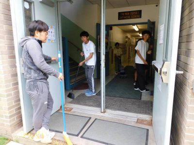 また、7時間目には縦割り清掃も行われました。最初に自分の教室を掃除し、その後縦割りグループとして校内をきれいにしました。NJ校では日本国内のように毎日清掃する習慣がないため、ほうきの使い方等不慣れな面もありますが皆、一生懸命担当箇所の清掃に取り組んでいました。