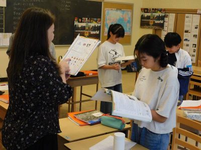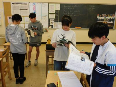 7年生2時間目は、英語です。今日は、互いに質問しながら教科書にある人物を当てるやりとりをしていました。