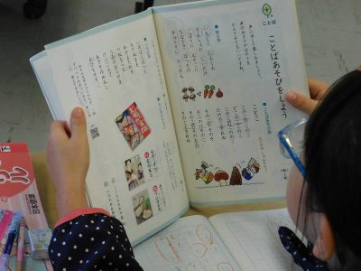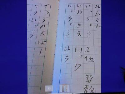 同じ時間2年生は、国語で“ことばあそび”の授業です。私が教室に入った時は、自分の作品を披露していました。日本語、英語、数字等を織り交ぜた作品をリズムよく発表していました。 最後にいろは歌もすらすら読むことができました。