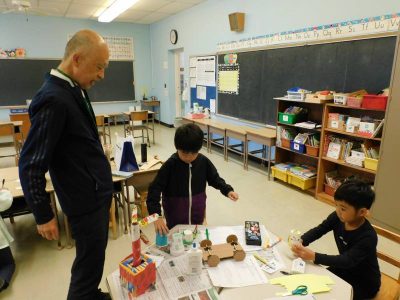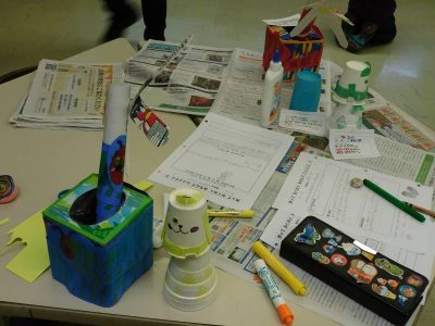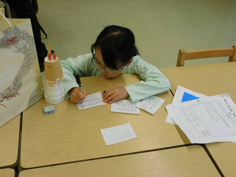 2年生1時間目は、生活科です。今日は、“おもちゃランド”で使う自作おもちゃの紹介文を書きました。全部で5種類あるおもちゃはどれも力作ばかりです。途中、動作確認をしていましたが、いつのまにかおもちゃ遊びに夢中になる場面も見受けられました。