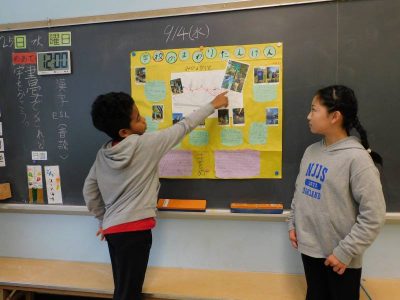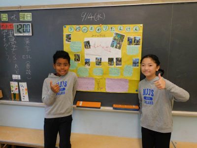 3年生2時間目は、社会科です。今日は、先日学校周辺を散策した“まち探検”の様子をまとめたプレゼン(発表)に招待されました。事前に探検地域は地図で学習していたものの、当日のミッションは現地で初めて知ったとのこと。7つのミッションを全てクリヤーし、戻ってからその成果をまとめ発表してくれました。プレゼンという最後のミッションがコンプリートした記念に、二人にはポーズをお願いしました。