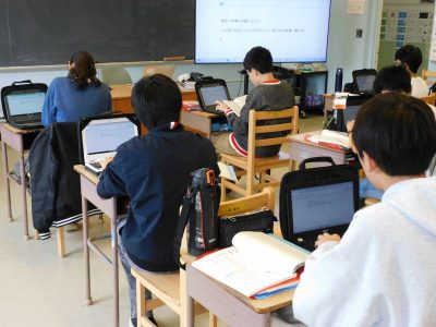 9年生3時間目は、国語です。今日は、教科書の『挨拶~原爆の写真によせて~』を読み、詩の中に出てくる言葉に触れながら人間と社会について考えたことを文章にしていました。短時間で制限字数(400字)の文章を仕上げることに苦労している生徒もいました。