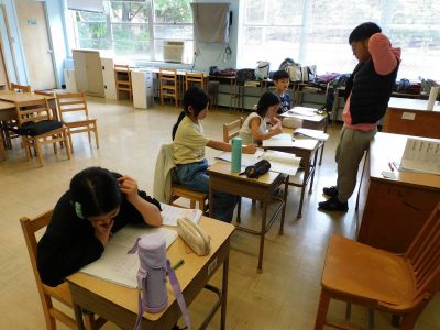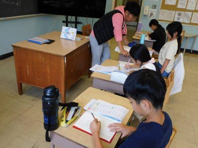 同じ時間5年生は、算数です。私が教室に入った時は、分数のたし算・ひき算や約分・通分にかかわる計算ドリルに取り組んでいました。5年生算数にとって大切な単元に一生懸命取り組んでいました。