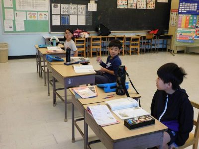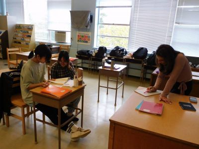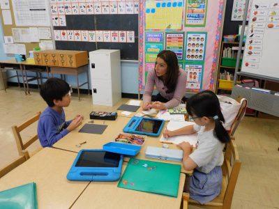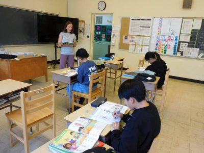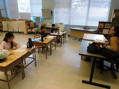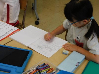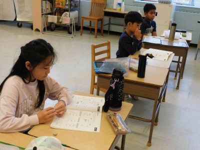 初等部2、3年生4時間目もESLです。Re先生の授業では、母音、子音に注意しながらテキストの空欄に文字を入れていきました。Ro先生の授業では、土曜日・日曜日の出来事を日記風にまとめていました。