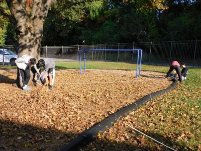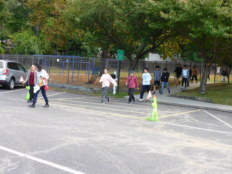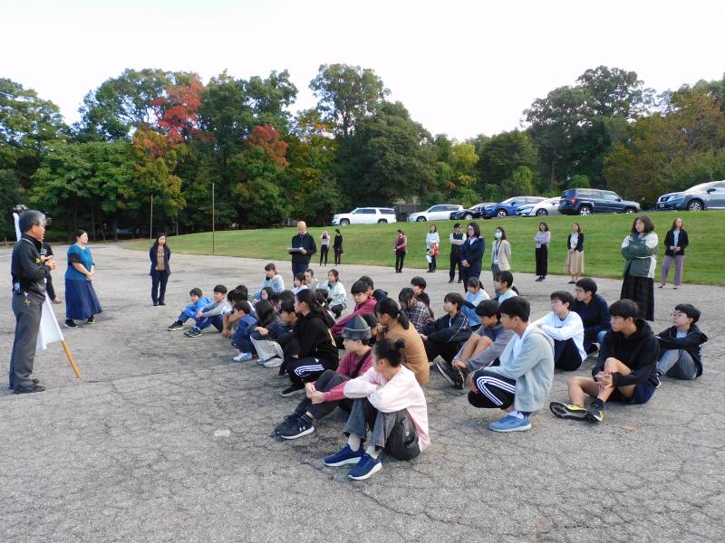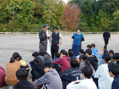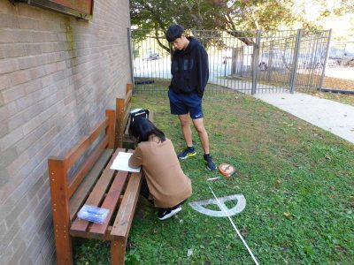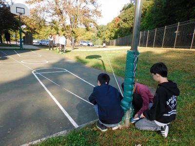 9年生は、数学です。今日は、メイプル広場で実際の大きな三角形を実測し、相似を使ってより大きな図(池)の値を求める学習に取り組んでいました。