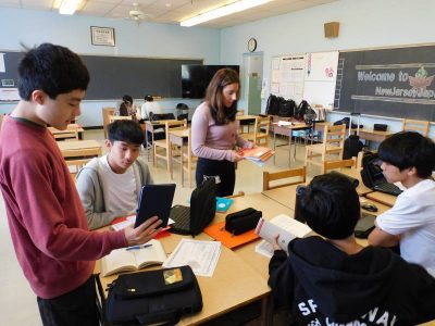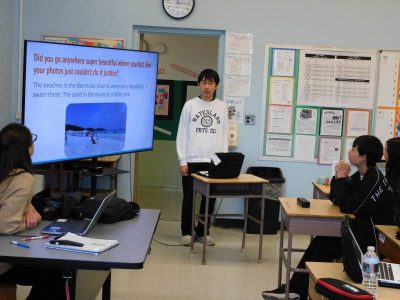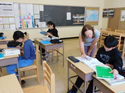 中等部3時間目は、ESLの時間です。Ro先生の授業では、ペアで詩についての学習をしていました。Na先生の授業では、体の部位について理解を深めていました。Re先生の授業では、英語でのプレゼン後、発表者への質問をしていました。