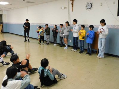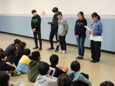 本日メイプルタイムに、全校レク“かくれんぼ大会”が行われました。最初に全員がコナーズホールに集合し、代表委員からルール説明がありました。その後、鬼(代表委員)以外は一斉に校舎内に散り、3分後にかくれんぼが始まりました。隠れることができる場所は校内の、校長室・職員室・保健室・理科室・トイレ等以外です。代表委員は二人組になって、時間差で校内を探し回りました。見つけられた児童・生徒は放送室に報告し、代表委員が見つかった児童生徒の名前を放送しました。正味約7~8分間位の時間でしたが、鬼に見つからなかった児童生徒は10名で、見つかった児童生徒から大きな拍手を受けていました。低学年児童の中には、“まさかこんなところに”と思える場所でじっとしていたそうです。日頃できない活動に皆、大喜びでした。