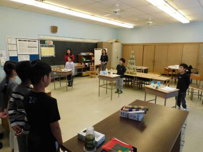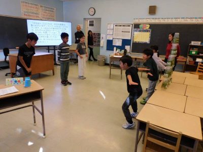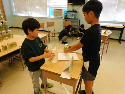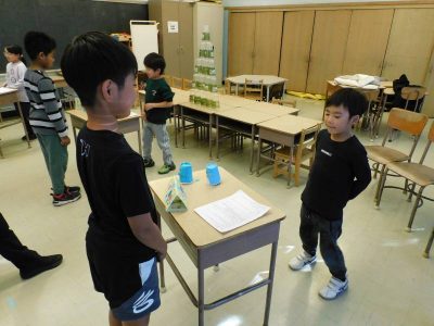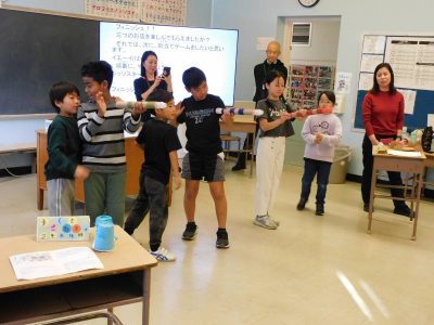 2年生生活科の単元として、「うごくうごくわたしのおもちゃ」があります。今日は、その一環として3、4年生を招いた“おもちゃランド”が開かれました。最初に2年生から、自分たちが作ったおもちゃについて説明がありました。その後は、各テーブルに分かれ、おもちゃランドの開始です。3種類のおもちゃをローテーションしながら楽しみました。次に、プラスティックのコップを特製の筒鉄砲で倒すゲームに挑戦しました。見事倒した際には、大きな歓声が上がっていました。最後に3,4年生から今日の感想が一人ずつ紹介されました。
