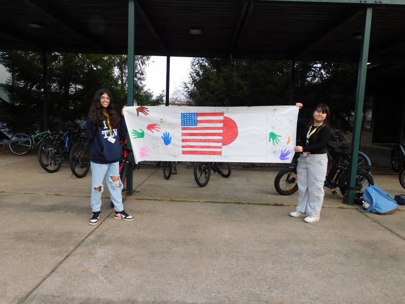 NJ校生徒は朝、現地に直接集合し、クレスキル校生徒と初めて対面で会いました。保護者の方も送迎にお手伝いいただきました。また、手作りのバナーもNJ校を迎えてくれました。